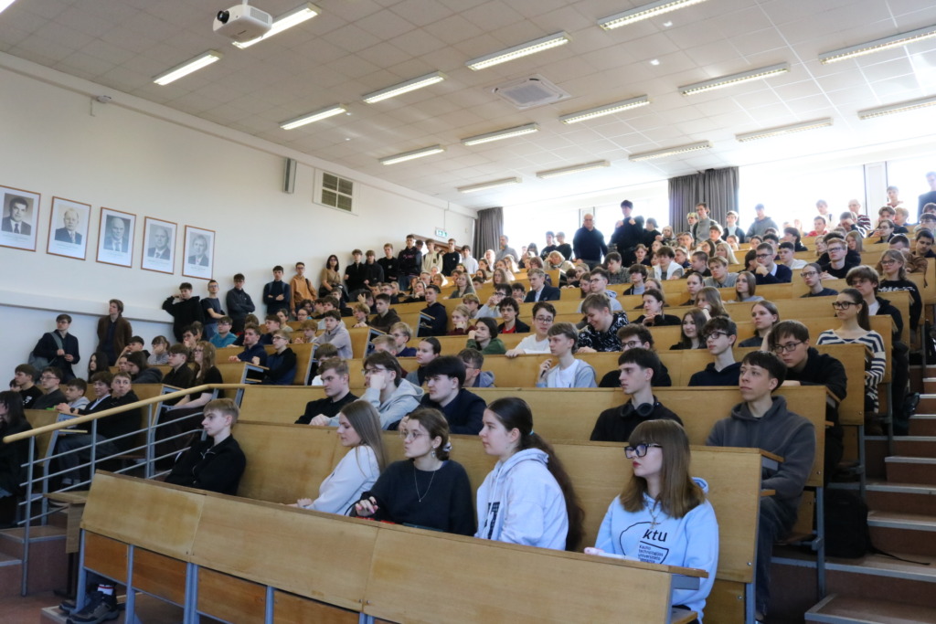 Po uždavinių sprendimo moksleiviai buvo pakviesti į KTU MGMF Fizikos katedros docento dr. Vytauto Stankaus paskaitą „Nuo Hubble iki JWST: kaip galaktikos pakeitė mūsų Visatos supratimą“, taip pat turėjo galimybę apsilankyti mokomosiose laboratorijose ir geriau susipažinti su studijų bei mokslo aplinka universitete.